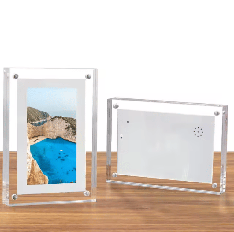اشحنه، انقل ملفات الفيديو إليه عبر USB من الكمبيوتر إلى المجلدات المخصصة، قم بتشغيله لعرض الذكريات، ويمكن وضعه عموديًا للعرض الأمثل.