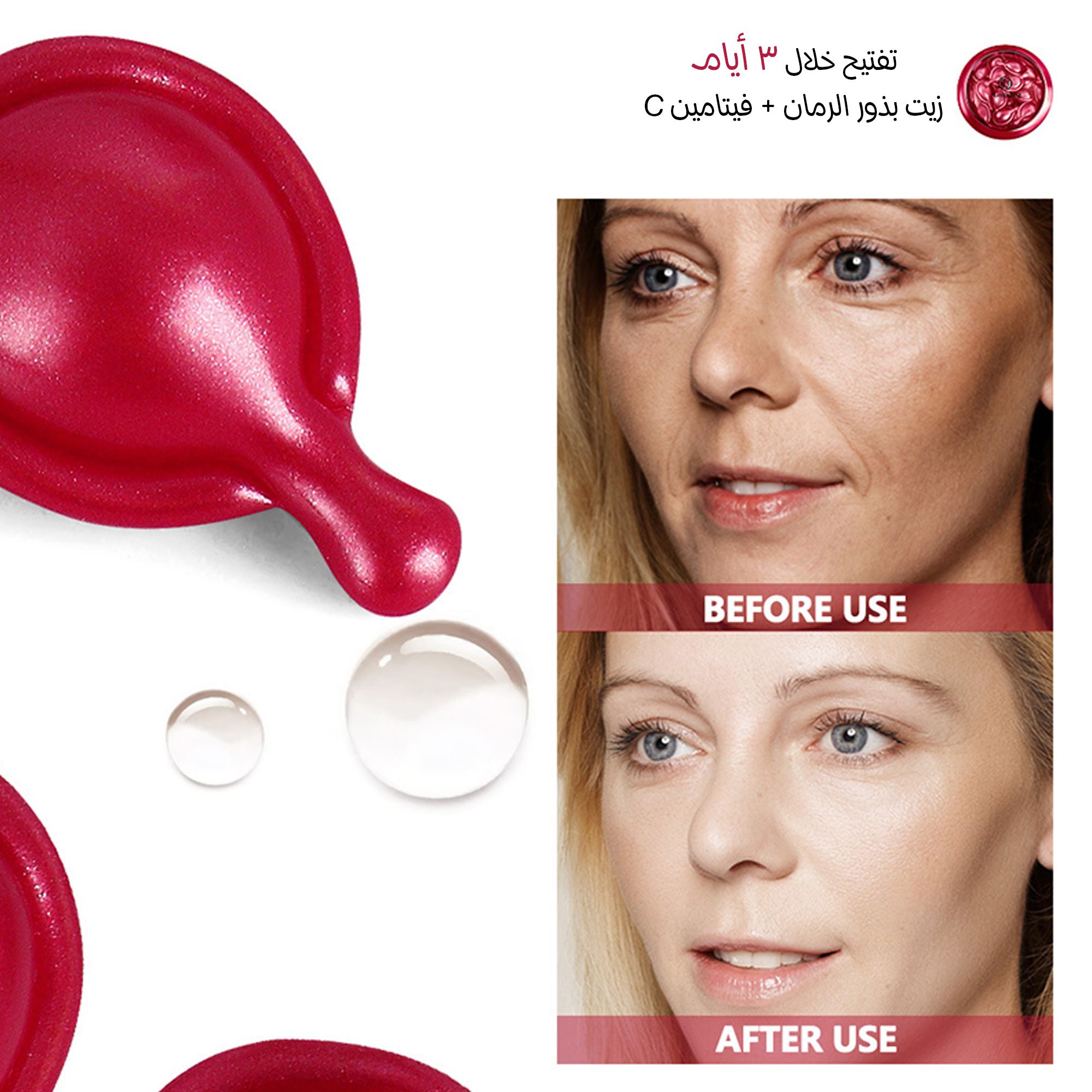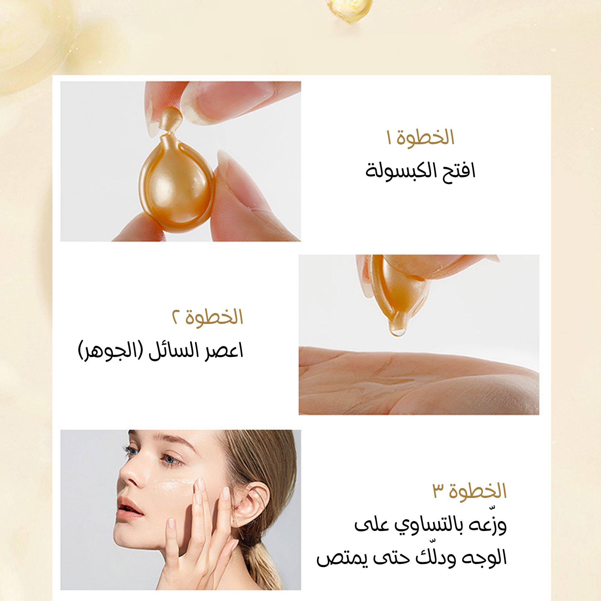 كسر الكبسولة ودلك السيروم مباشرة على وجهك صباح أو مساء